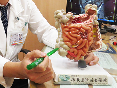 黃老太太一年前間歇發生下腹部疼痛,在住家南投附近醫院始終查不出真正病因,醫師診斷是老人家排便不順,開軟便劑服用,症狀稍有改善。但今年四月中旬,黃老太太卻已經吃不下飯,� ��部腫脹、想吐,睡也睡不好。就近就醫透過電腦斷層檢查發現,大腸腫瘤造成嚴重阻塞,但考量年紀,醫師建議到大醫院後續處理,輾轉由臺中慈濟醫院大腸直腸外科方佳偉醫師收治。