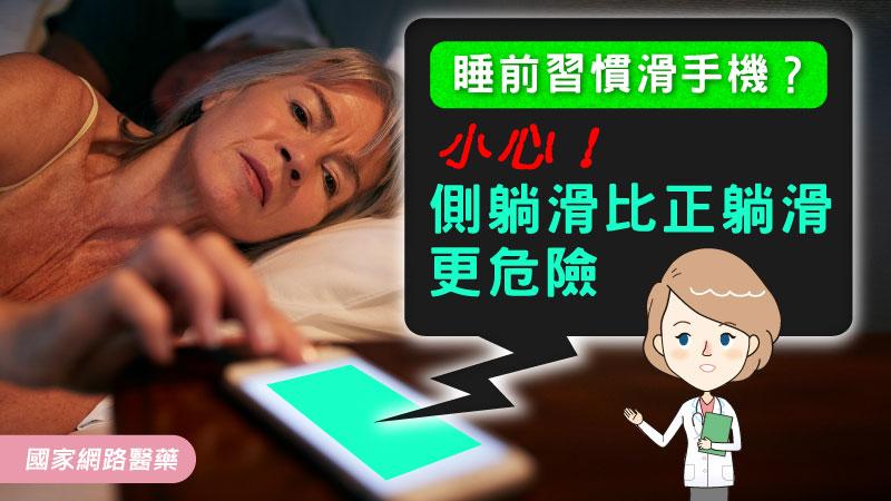 【編按:不少人睡前習慣在床上躺著滑手機,有時候還會不小心砸到臉。但是醫師提醒,側躺 滑手機的姿勢,恐怕會有乾眼症、青光眼,甚至有失明的危險!輔英科技大學附設醫院眼科主治醫師洪啟庭表示,由於側躺壓迫到脖子的頸動脈,使眼睛的血液循環變差,眼睛更容易疲勞。若你隔天醒來感覺有點眼花、流淚,可能就是昨晚眼睛太累了,長期「側躺滑」則會造成眼壓升高、壓迫視神經等情況。】
