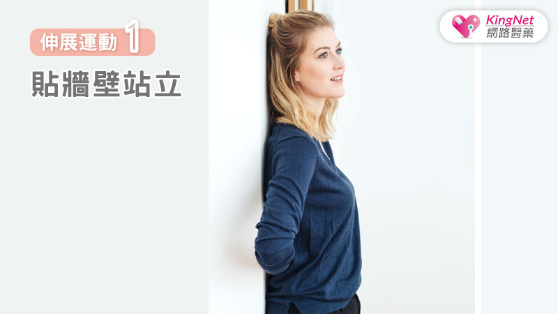 將兩腳打開與肩同寬,抬頭挺胸縮下巴,將後腦杓、兩側肩胛骨、臀部及後腳跟輕鬆靠著牆壁,且鼻子、下巴、胸骨連成一直線,一次維持5~10分鐘,一天3次。除了能改善駝背姿態,養成抬頭挺胸習慣。
